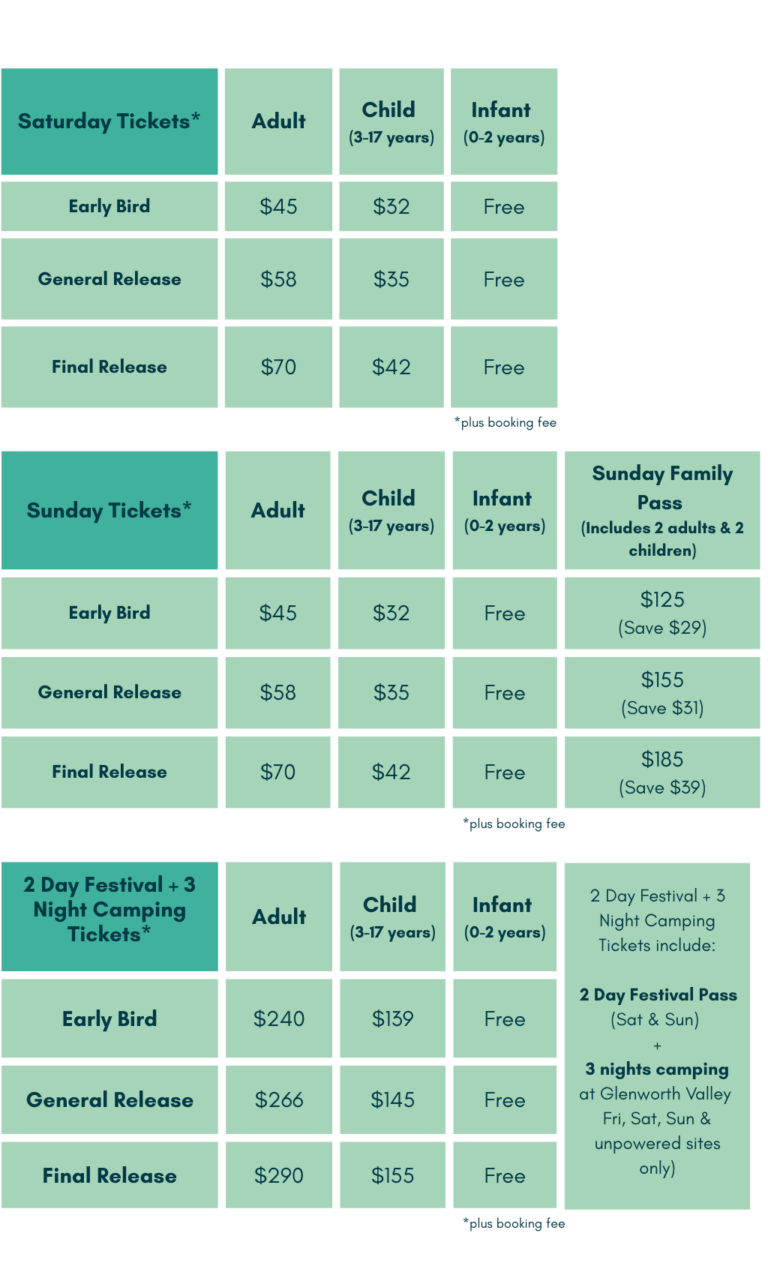 Tickets are inclusive of event activities and entertainment for the date specified on your ticket as well as standard parking and Glenworth Grazing Festival tasting glass. Ticket entry does not include food or drinks.
