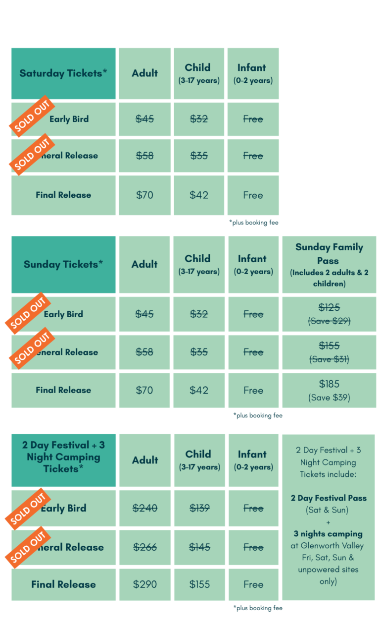 Tickets are inclusive of event activities and entertainment for the date specified on your ticket as well as standard parking and Glenworth Grazing Festival tasting glass. Ticket entry does not include food or drinks.